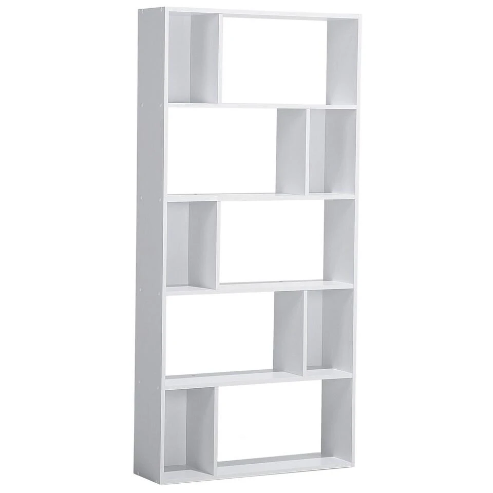 Decoratieve boekenkast met modern design. Deze unieke boekenkast is geschikt als praktische opbergruimte voor jouw boeken en als tentoonstellingsruimte voor decoratiestukken. Dankzij de open structuur is deze boekenplank ook ideaal om als scheidingswand te gebruiken. De verspringende opstelling van de grotere, open en kleinere, gesloten compartimenten geven de stevige plank een speels effect en een dynamische uitstraling.