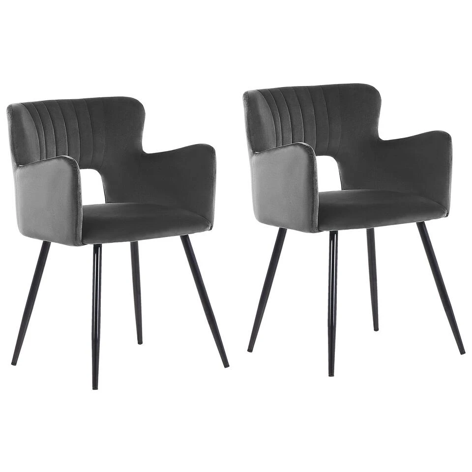 Stoel met fluwelen stoffering in donkergrijs. Deze stoel heeft een klassieke kleur en een modern design – de interessant gevormde rugleuning en de fluweelzachte bekleding creëren een harmonieus geheel en maken de stoel een veelzijdige metgezel voor je eetkamer of bureau. De vier smalle, maar stabiele poten zijn gemaakt van gepoedercoat staal en geven het meubel een aangename lichtheid.