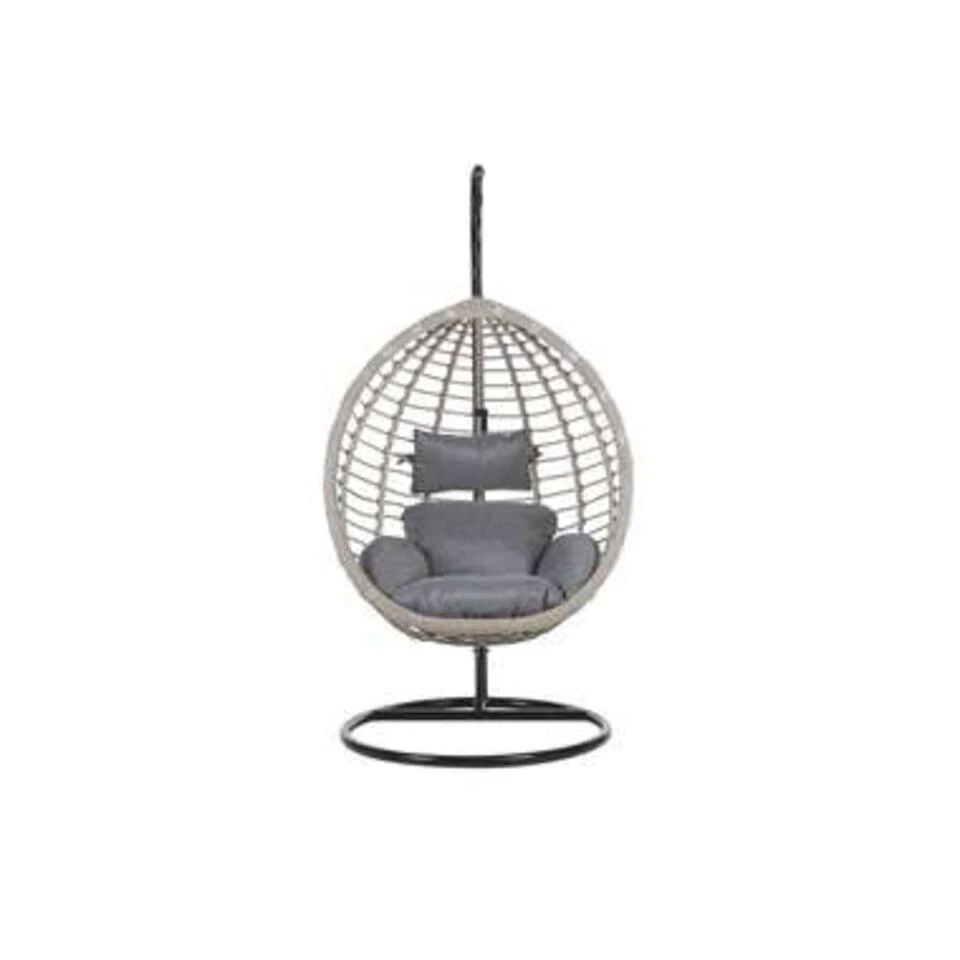 Rotan hangstoel in stevig zwart metalen frame inclusief kussens. In woonkamer, wintertuin of balkon – deze stijlvolle hangstoel van onderhoudsvriendelijk polyrotan heeft een stabiel stalen frame en kan daardoor overal geplaatst worden. De mand is stevig bevestigd via een ketting waardoor hij zachtjes wiegen. De twee comfortabele, stevige kussens zijn waterbestendig.