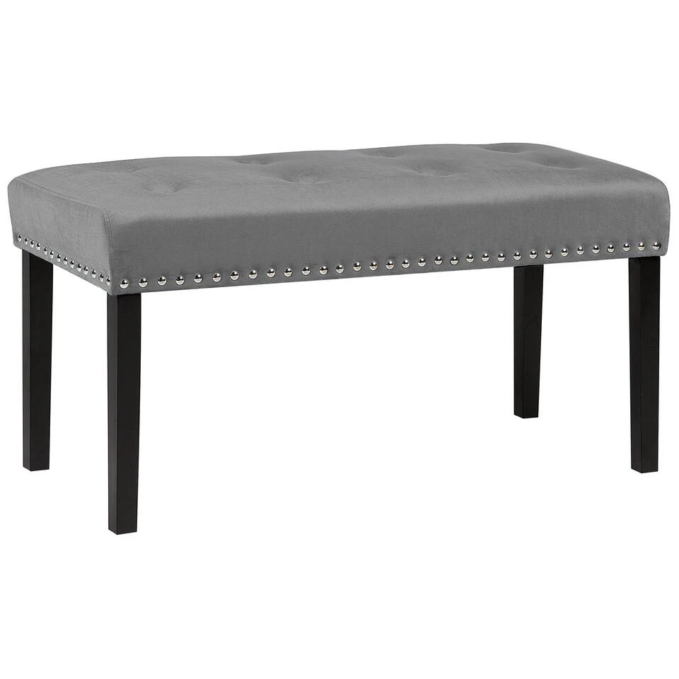 Elegante bank in het grijs met metalen klinknagels. Dit stijlvolle fluwelen bankje past in jouw eetkamer, slaapkamer of woonkamer. Het is zeer comfortabel dankzij de voering van zacht schuim. Het bijzondere van dit meubelstuk is de versiering met klinknagels van metaal, waardoor het bankje er erg stijlvol uitziet.