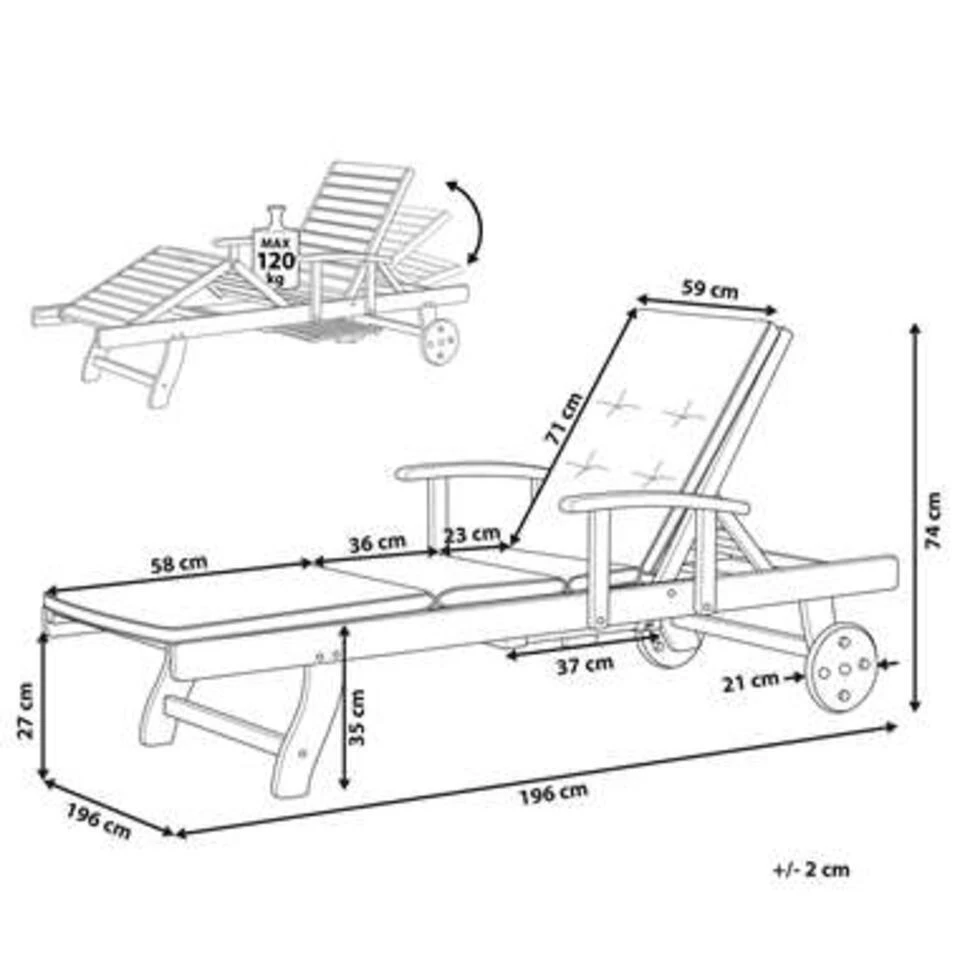 Belangrijkste eigenschappen: Rugleuning in 5 posities verstelbaar, Praktische touwtjes voor gemakkelijke bevestiging aan de zitting, Gemaakt van natuurlijk resistente materialen, Robuuste constructie van het frame, Speciaal gemaakt voor gebruik buitenshuis, UV-bestendigheidsklasse 5 (ISO 105-B02)