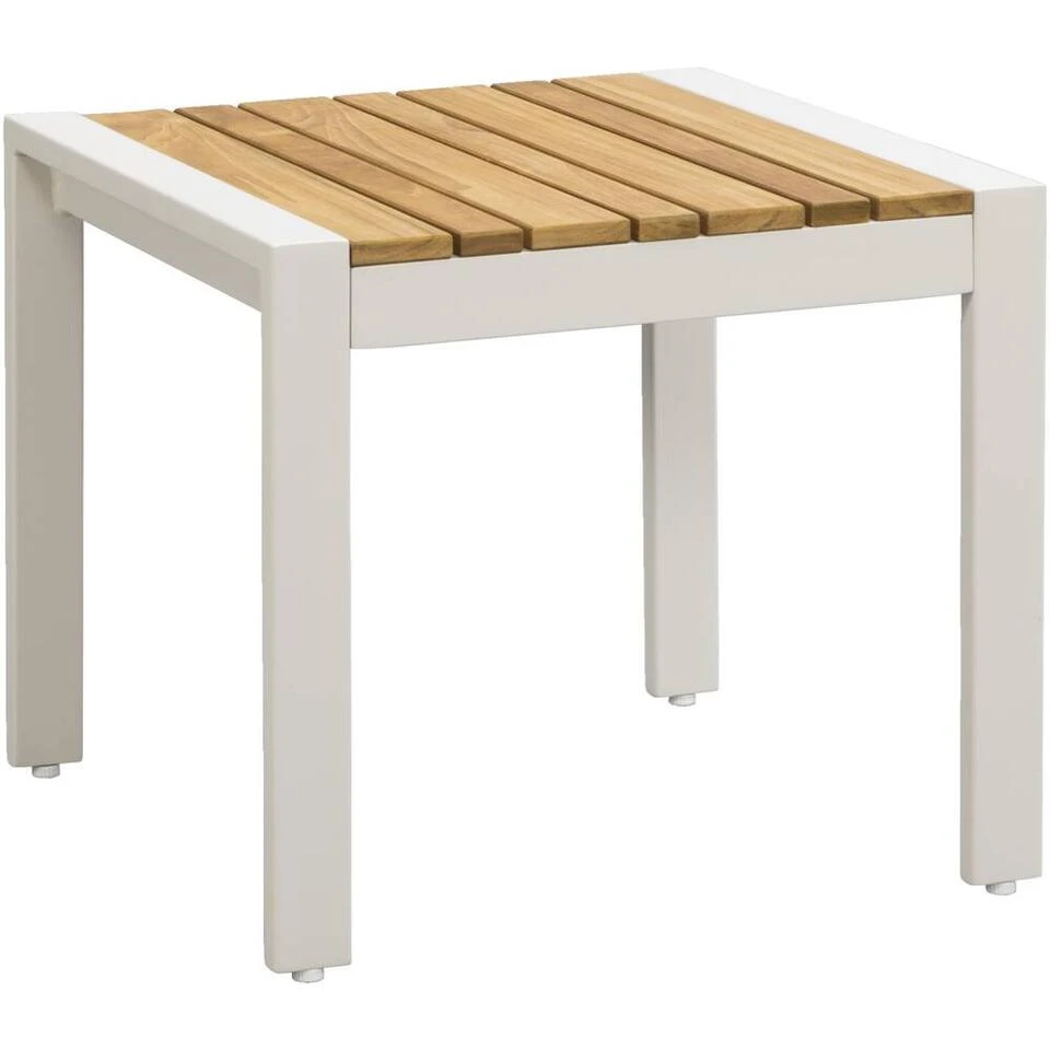 Bijzettafel Biarritz is een modern tafeltje voor in de tuin gemaakt van hout en aluminium. De poten van bijzettafel Biarritz hebben een mooie zandkleur en het teakhouten blad van de salontafel is netjes verwerkt in het onderstel. De bijzettafel heeft een afmeting van 45x50x50 cm en is perfect te combineren met de andere Biarritz tuinmeubelen. Creëer meer tafelruimte in je tuin met bijzettafel Biarritz.