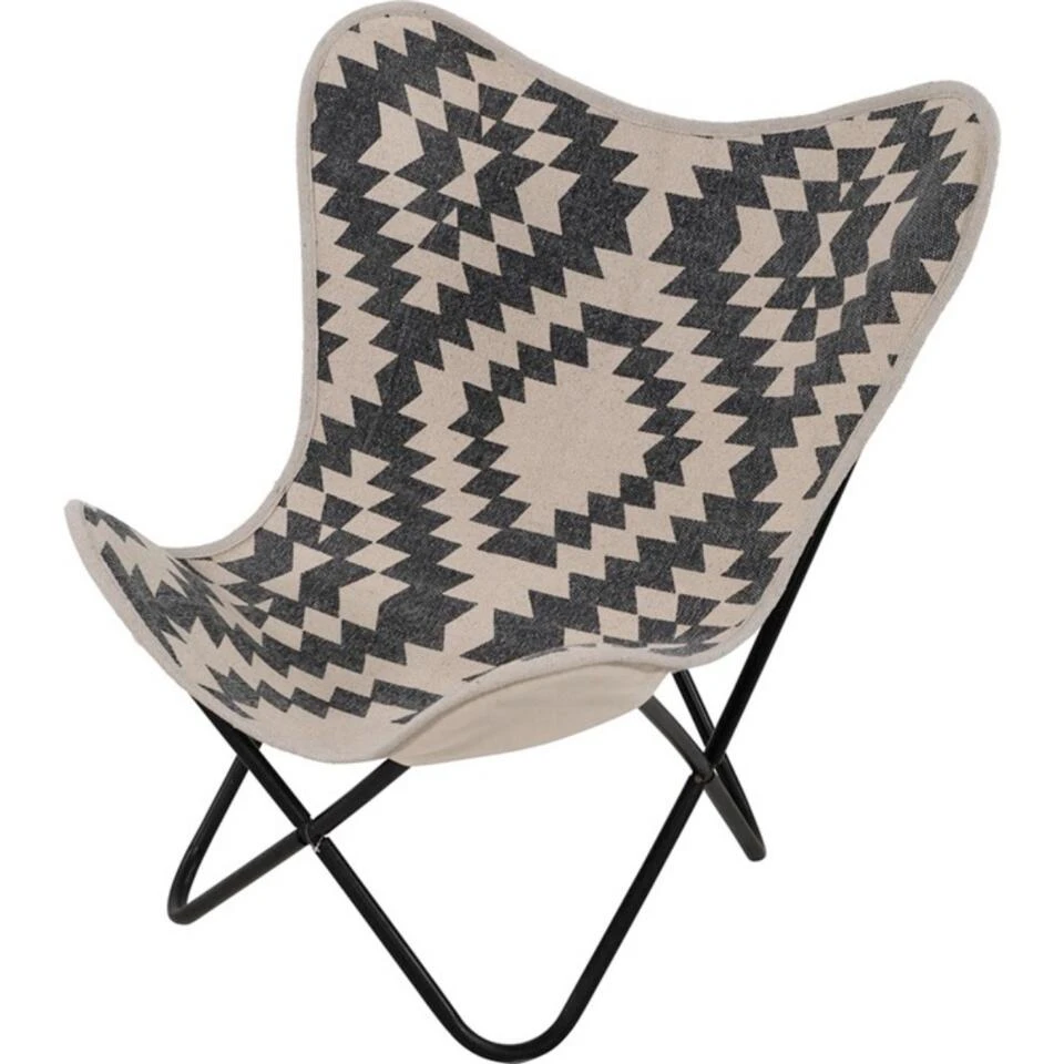 Geniet van het natuurlijke design van Brent vlinderstoel! Dit rustieke exemplaar komt uit de collectie van het woonmerk Les en heeft een afmeting van 75x75x87cm. Hij is voorzien van een stevig ijzeren frame met een zwarte kleur als afwerking. Kenmerkend voor zijn design is de vlindervormige zitting, welke is uitgevoerd in zwart/wit polykatoen met een leuke print. Brent vlinderstoel voelt zich thuis in vele woonstijlen, waaronder een basic, landelijk, trendy en stoer interieur. Maximaal draaggewicht: 100 kg. De Brent vlinderstoel zwart/wit is niet inklapbaar.