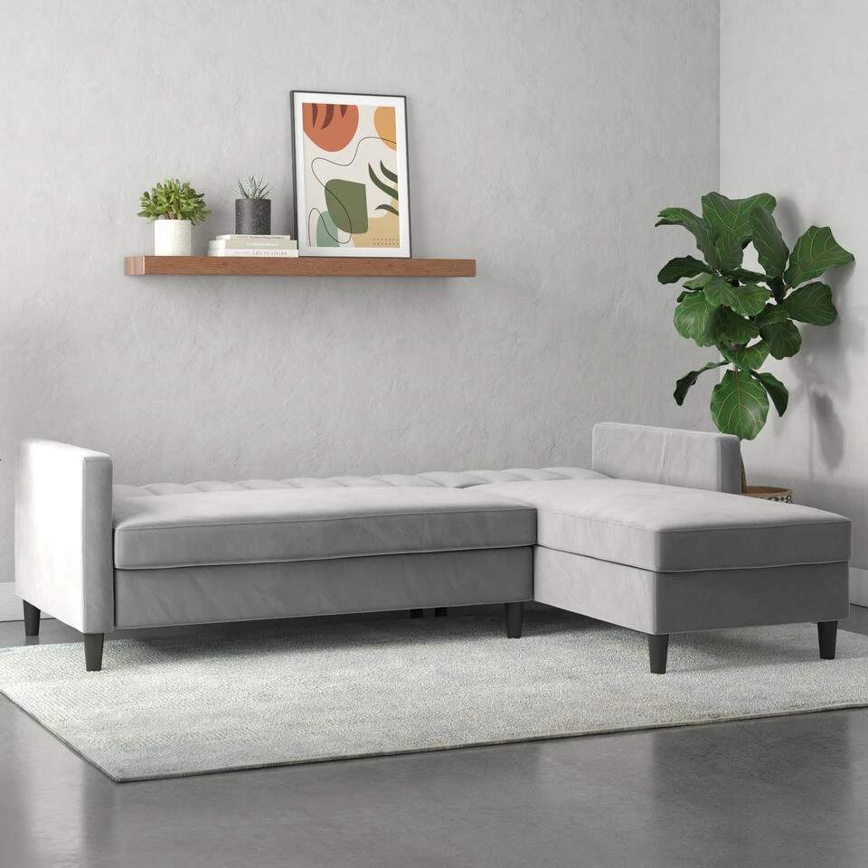 Deze slaapbank heeft een moderne stijl. Het is gemaakt van gefabriceerd hout en een fluwelen hoes. De vulling is gevuld met schuim voor optimaal comfort. De hoekbank heeft een uitbreidbaar slaapoppervlak en kan als logeerbed worden gebruikt. Het is handmatig verstelbaar. De chaise longue kan worden geopend voor opslag.
