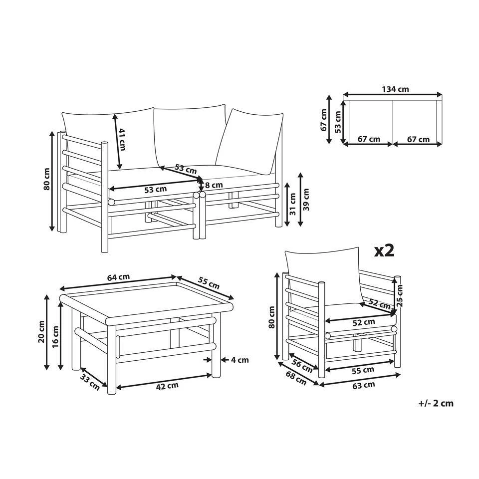 Afmetingen 2-zitsbank: 134x67x80