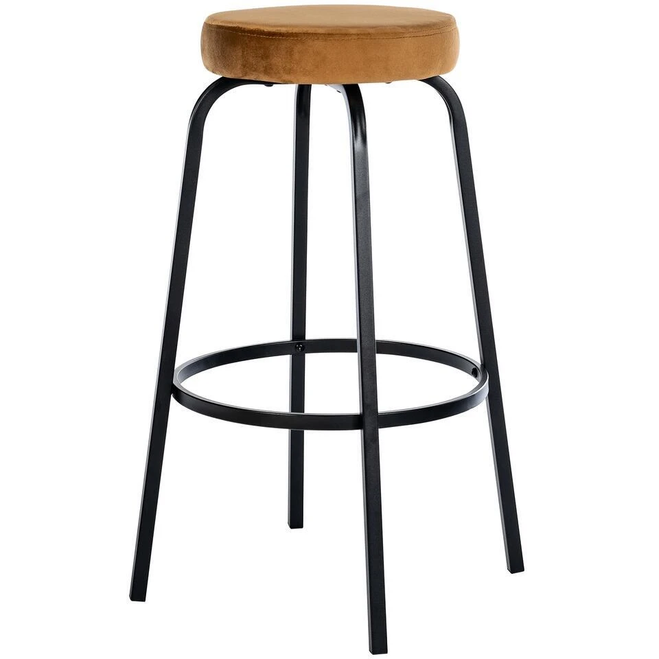 De Kamari barkruk maakt indruk met zijn tijdloze combinatie van een ronde gestoffeerde zitting en een matzwart metalen onderstel met vier poten.