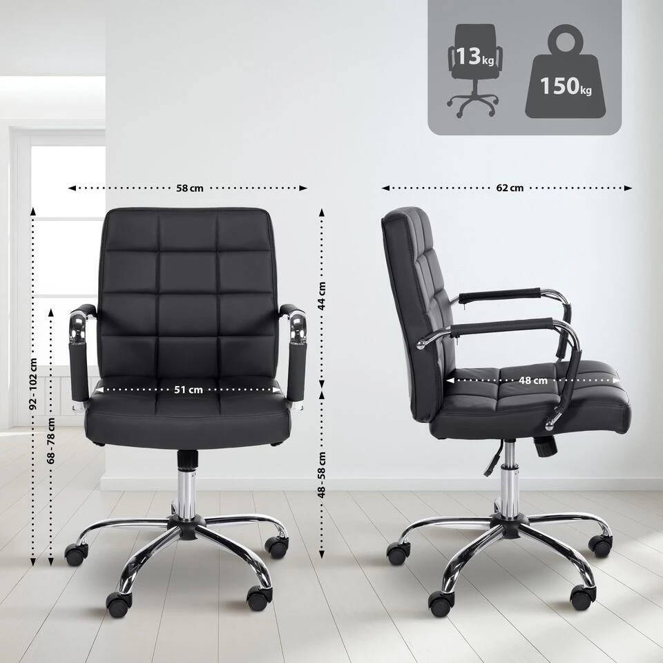 Met armleuningen en een rugleuning biedt hij comfortabele ondersteuning, vooral voor de onderrug. Het stevige metalen frame met lichtlopende wielen zorgt voor stabiliteit en veel bewegingsvrijheid, waardoor de bureaustoel veilig een belasting van 150 kilo kan dragen.