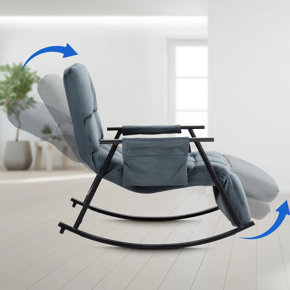 De bekleding met modieus doorgestikt patroon is verkrijgbaar met een stoffen of fluwelen hoes. Het gepoedercoate metalen frame draagt bij aan de moderne uitstraling en hoge stabiliteit. De schommelstoel kan een gewicht tot 125 kilo veilig dragen.