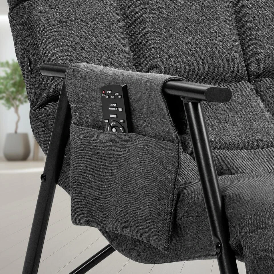 De dikke vulling over de rugleuning, zitting en voetensteun is essentieel. De zit- of ligpositie kan worden aangepast omdat de rugleuning en voetsteun verstelbaar zijn. Armen kunnen op de armleuningen worden geplaatst. Eén armleuning is voorzien van een zijvak voor persoonlijke spullen.
