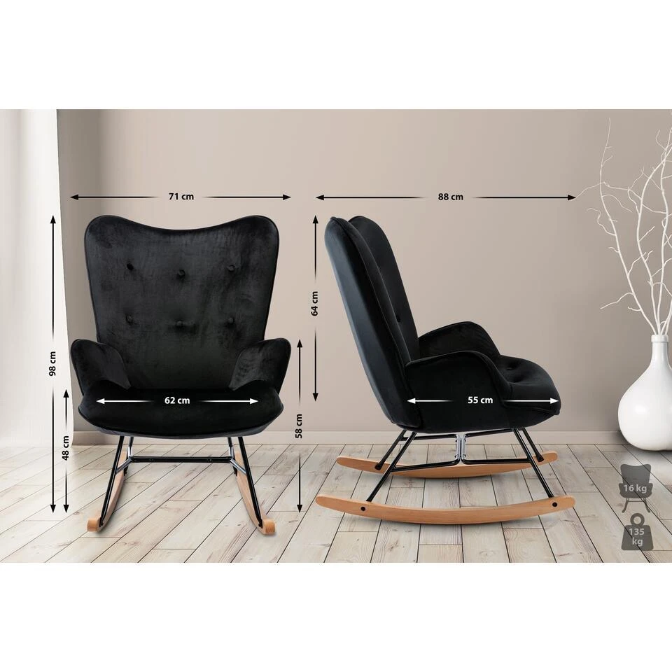 De schommelstoel Sanka is een comfortabele, stevige en tegelijkertijd stijlvolle stoel voor dagelijks gebruik. Het moderne meubelstuk past ideaal in bijna elke woonsfeer. De comfortabel gestoffeerde zitting met fluwelen overtrek belooft een aangenaam zitcomfort. De knopen op het rugkussen zetten modieuze accenten. De elegant gevormde beukenhouten lopers zijn vastgeschroefd aan een hoogwaardig zwart gelakt metalen frame, dat de stoel zijn grote stabiliteit geeft. Een allround mooi meubelstuk waar u lang plezier van zult hebben.