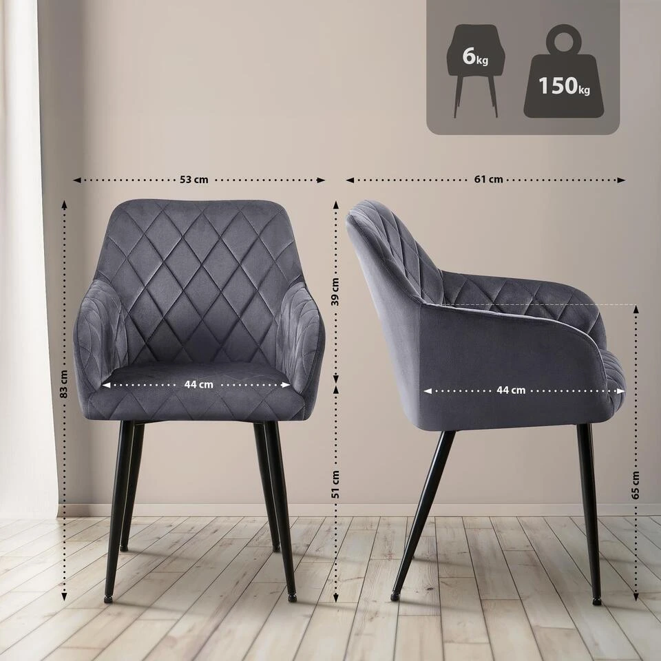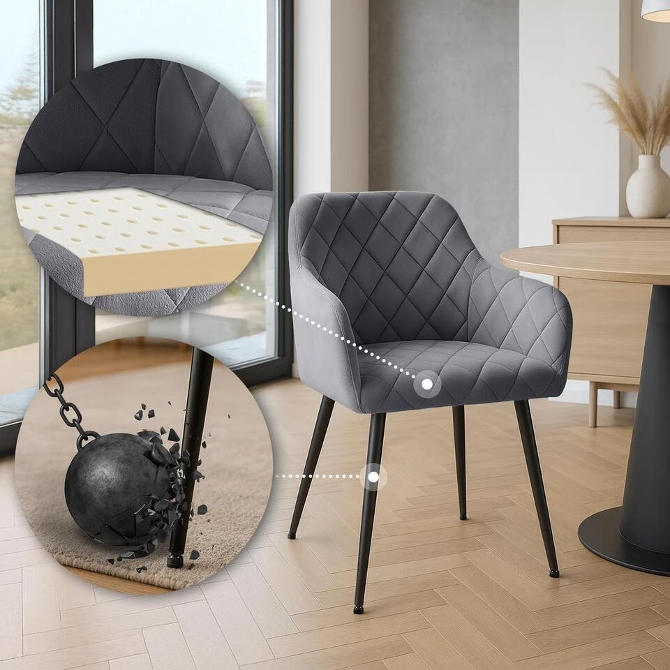 Het vierpotige metalen frame belooft stabiliteit en een veilige stand. De gestoffeerde stoel kan veilig lasten tot 150 kilo dragen. De vloerbeschermers onder de stoelpoten voorkomen beschadiging van gevoelige vloeren.