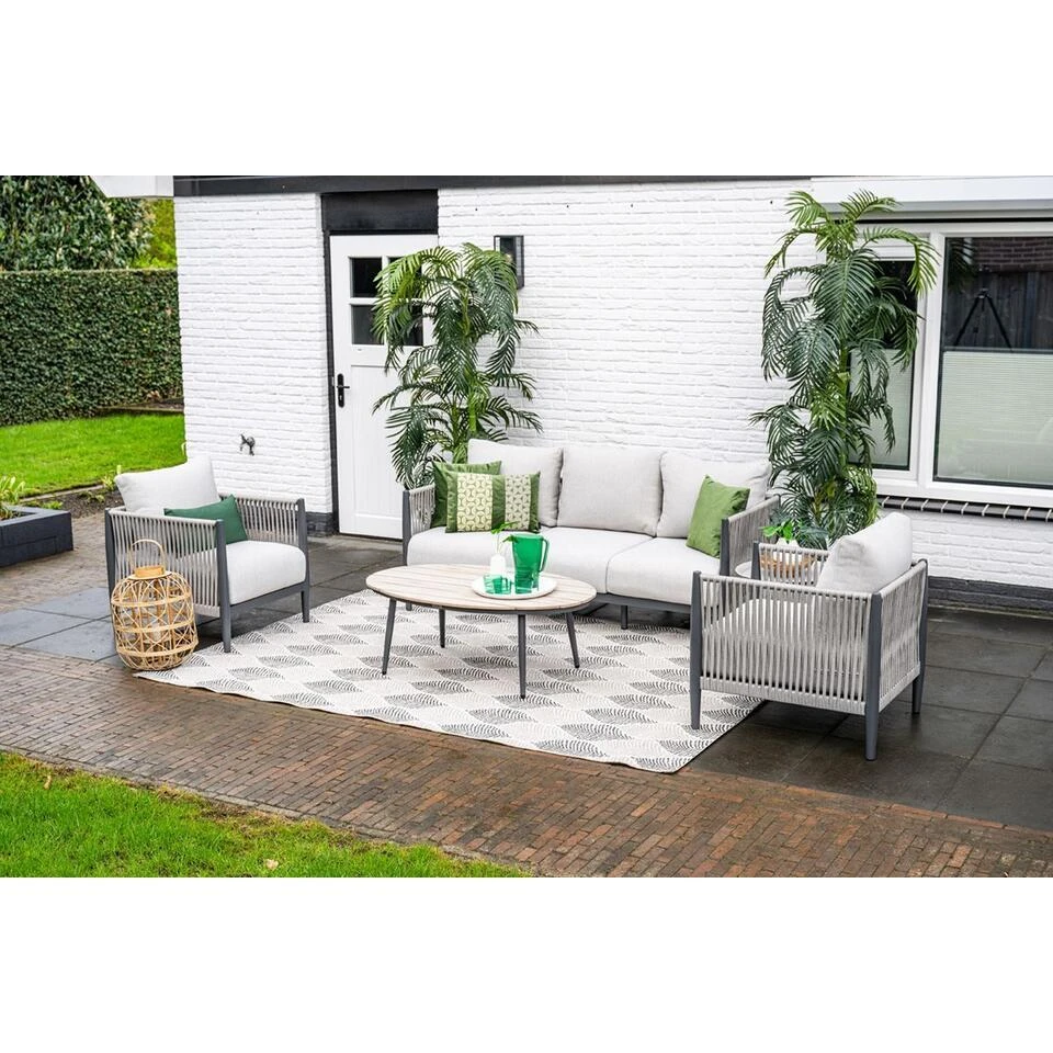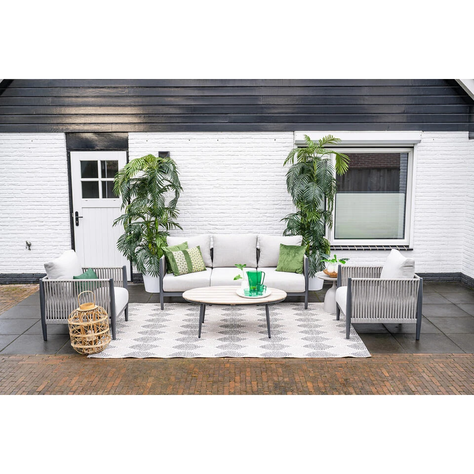 De Diamo set heeft een elegante uitstraling, dit komt door de smalle armleuningen en de chique, stoffen band waarmee de zijkanten van de armleuningen zijn afgewerkt. Het frame van de set is gemaakt van onderhoudsarm, gepoedercoat aluminium. Dit materiaal is eenvoudig te onderhouden door dit af te nemen met een zachte, vochtige doek.