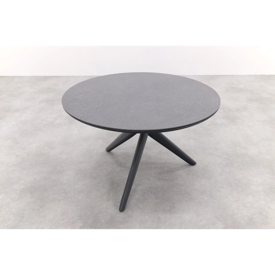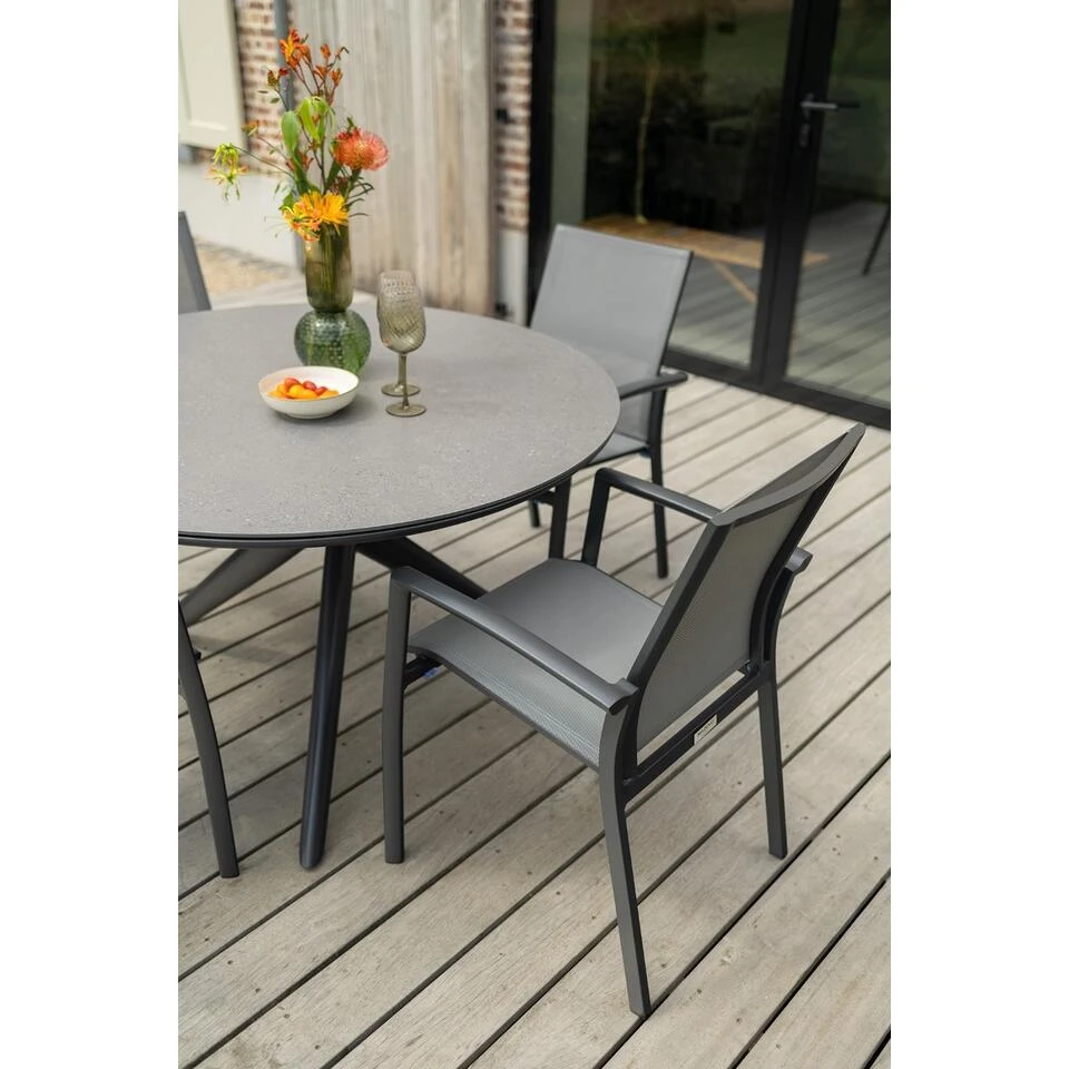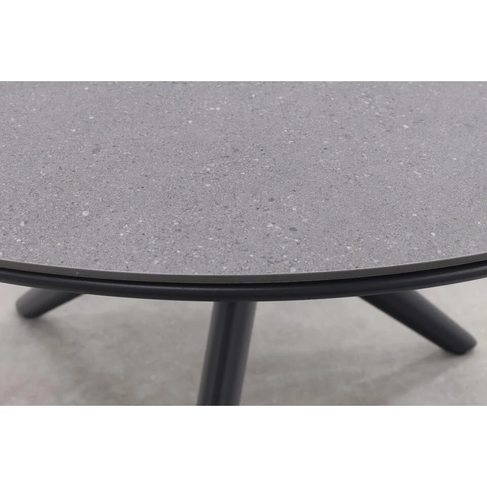 De poten van de Ronde tuintafel Dublin hebben een kruisvorm en zijn gemaakt van aluminium. Dit materiaal is licht van gewicht, stevig en het materiaal kan niet verroesten. Het tafelblad is gemaakt van “Sintered stone” eigenlijk een soort keramiek welke krasvast, hitte bestendig en uv bestendig is. Kortom het ideale materiaal om te verwerken in een tafelblad.