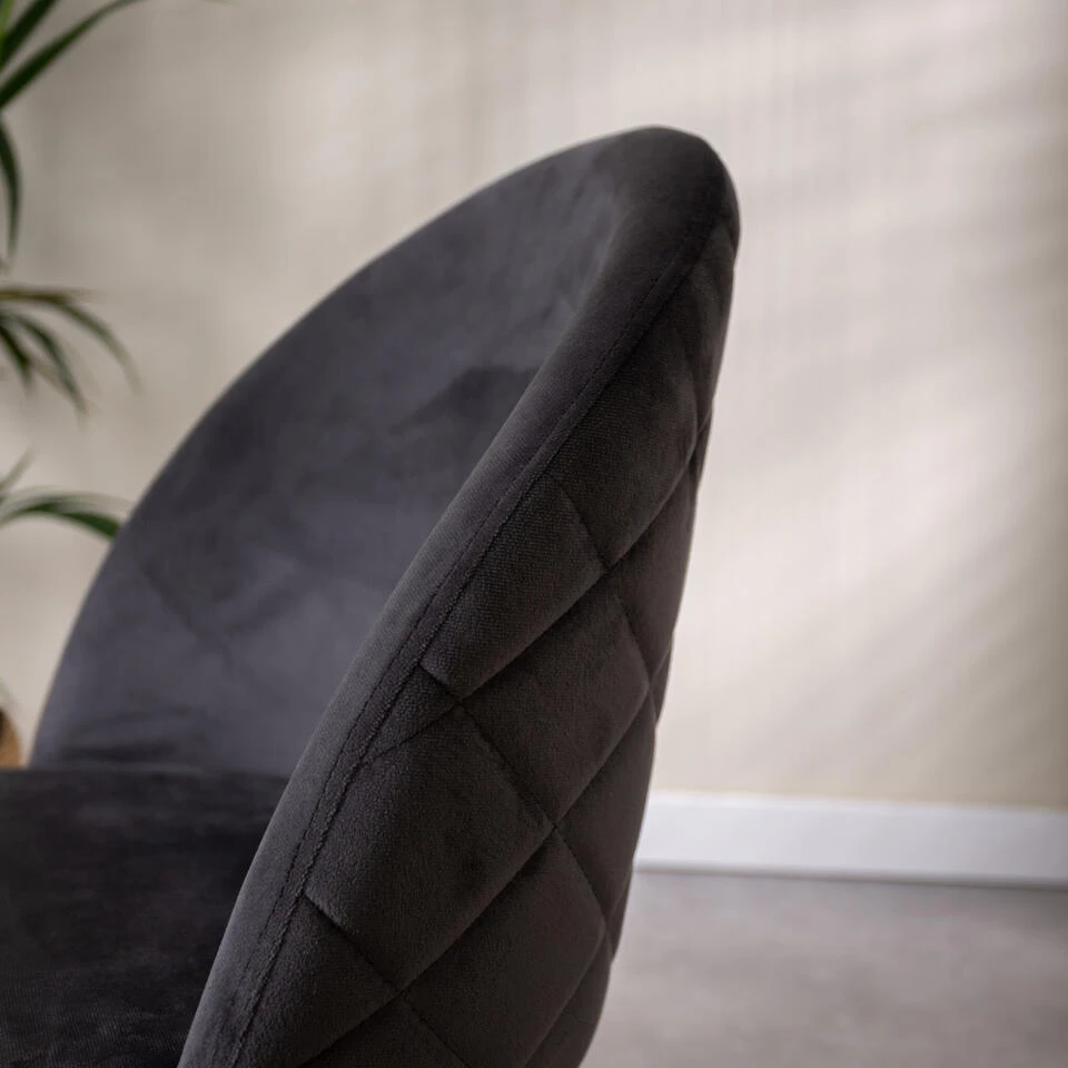 De eetkamerstoel is bekleed met velvet. Fluweel is een stofsoort ontstaan in Azië en dat rond 1400 is overgewaaid naar Europa. Bij fluweel worden er kleine lusjes geweven. Hierdoor ontstaat er aan de bovenkant een zachte, glanzende stof.