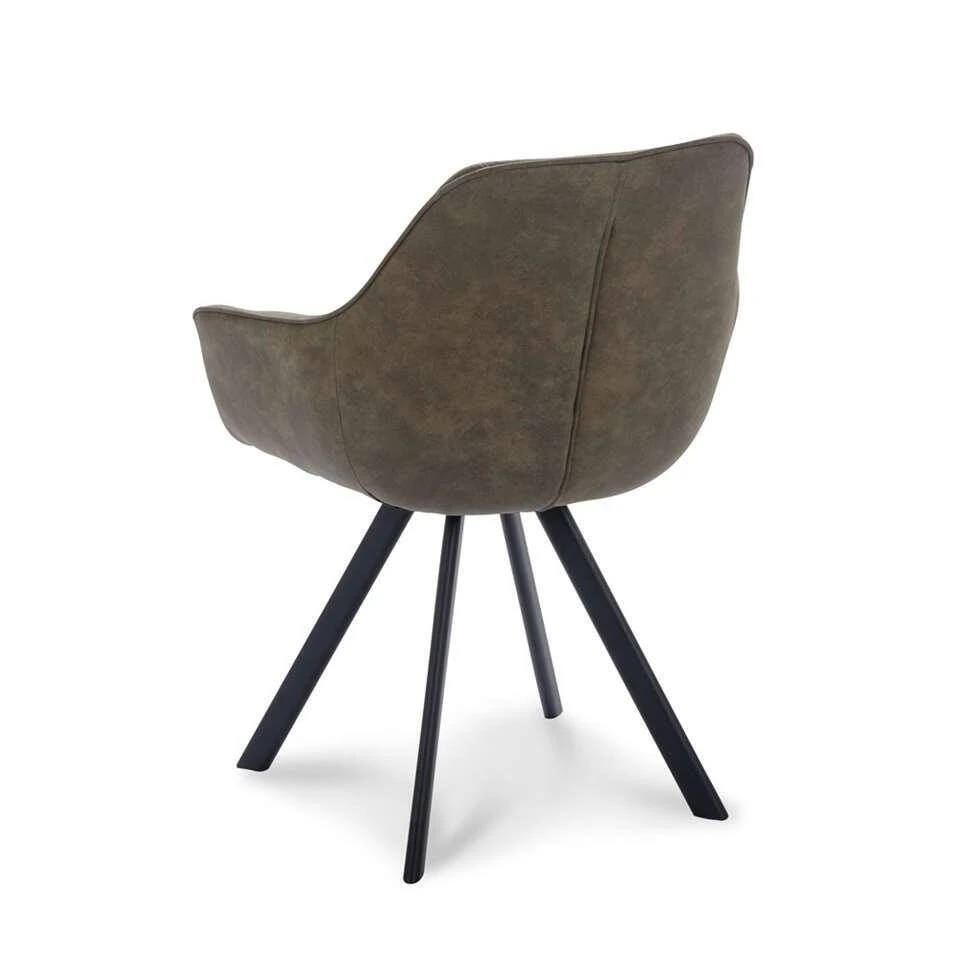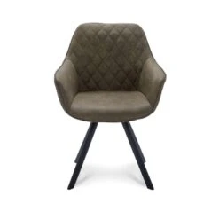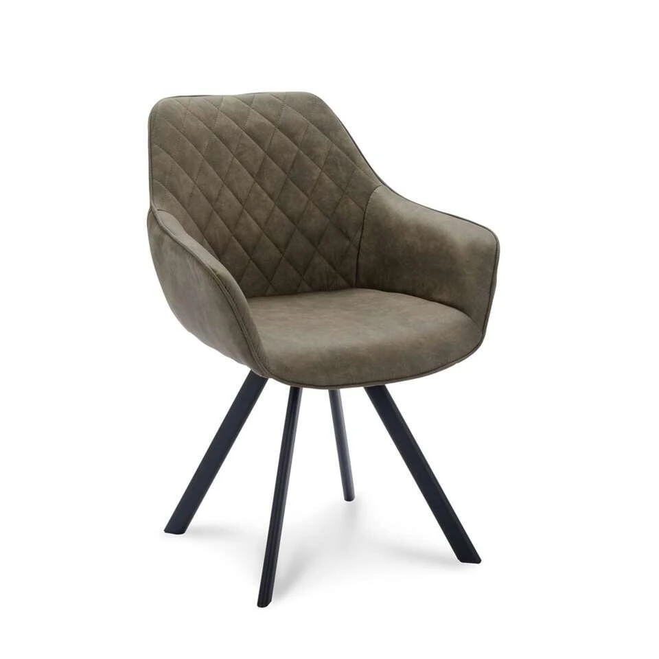Eetkamerstoel Riley met armleuningen is bekleed met een stoere en eigentijdse microvezel, in de kleur olijfgroen. De eetkamerstoel heeft een industriële look en hij kenmerkt zich door een hoog zitcomfort. Door de donkere metalen poten krijgt model Riley een erg stoere uitstraling en is hij passend in vele interieurs. De rug van model Riley is uitgevoerd met een geruit stiksel, wat hem dan ook helemaal van deze tijd maakt.