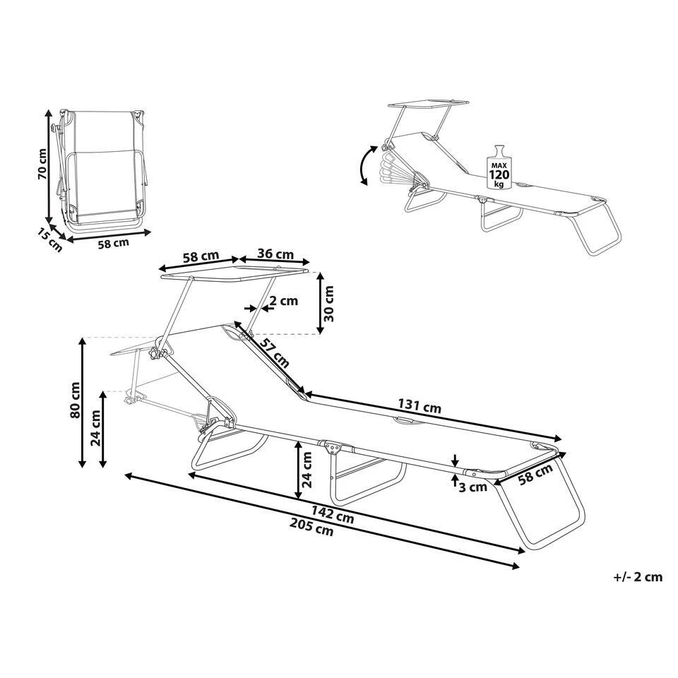 Belangrijkste eigenschappen: Functioneel zonnedak beschermt tegen zon en wind, Rugleuning in 5 posities verstelbaar, Modern terras- en tuinmeubilair, UV-bestendigheidsklasse 3 (ISO 105-B02), Gemaakt van natuurlijke, weerbestendige materialen