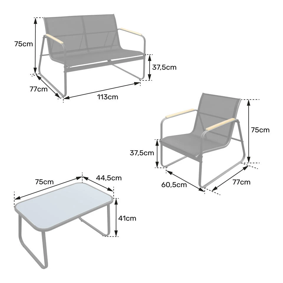Ténérife tuinmeubelen combineren functionaliteit en esthetiek met een 2-zitsbank, twee fauteuils en een rechthoekige salontafel. Het biedt de ultieme buitenervaring. Het stalen frame voegt een vleugje hedendaagse elegantie toe aan je tuin of terras. Deze Ténérife tuinsalon is perfect voor ontspannen momenten en wordt het middelpunt van uw gezellige bijeenkomsten zonder in te boeten aan comfort. Geniet van gezellige momenten met familie of vrienden in een moderne, uitnodigende omgeving.