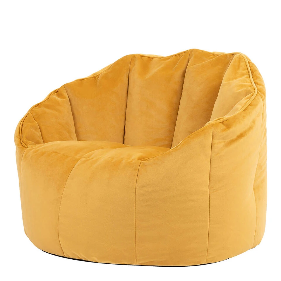 LUXE VOOR ELKE DAG; Een geraffineerde zitzak die belooft je huis te verrijken. De schelpvormige rug en glanzende fluwelen stof dragen bij tot de wow-factor van deze stoel.