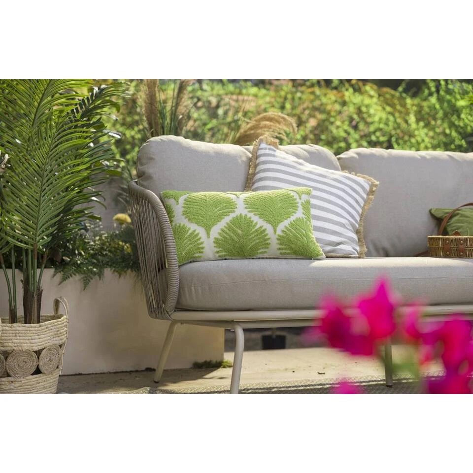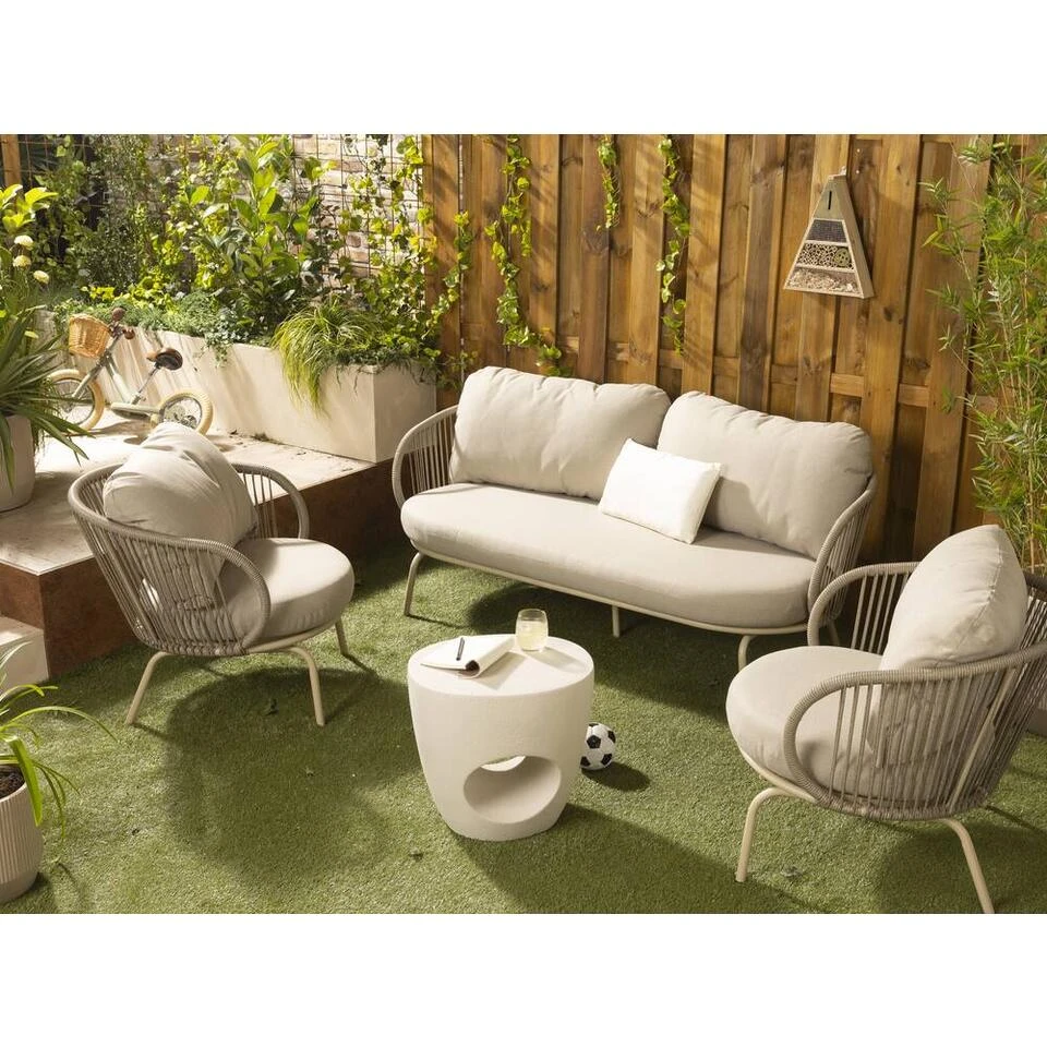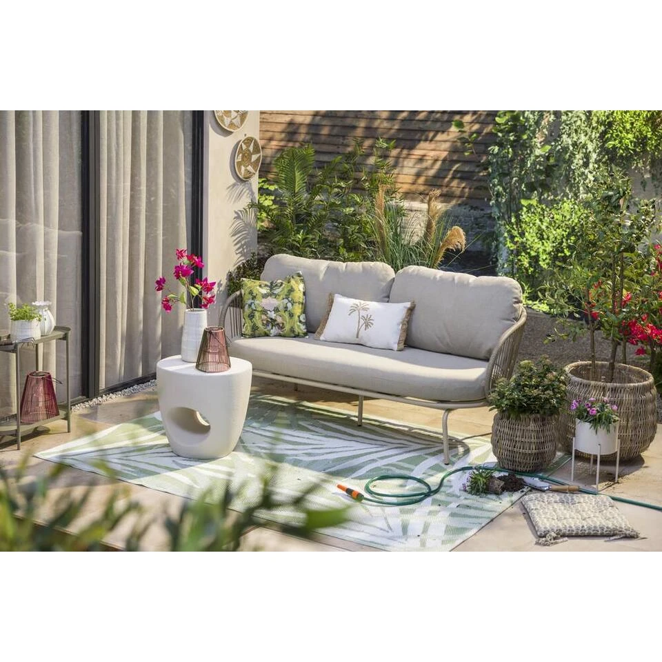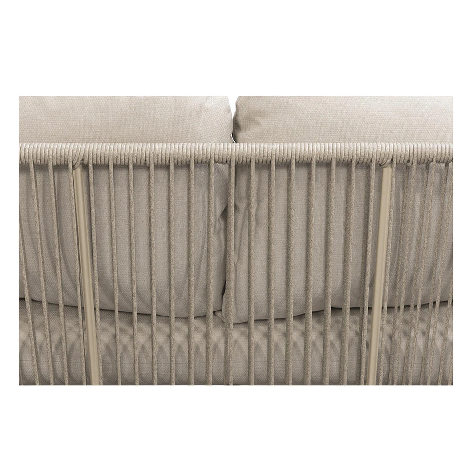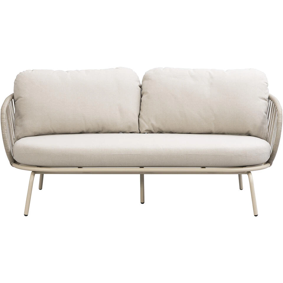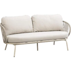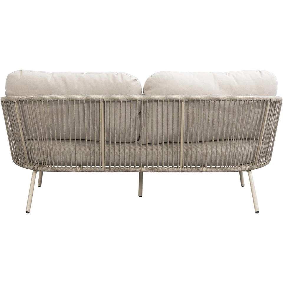 Loungebank Fermo heeft een zandkleurig, metalen frame met een kunststof zitting, rug- en armleuning in de kleur zand. De inbegrepen kussens zijn beigekleurig en passen perfect bij de natuurlijke uitstraling van de stoel. Je kunt in deze bank, met minimaal 2 personen, heerlijk wegzakken tijdens een heerlijke zomerdag.