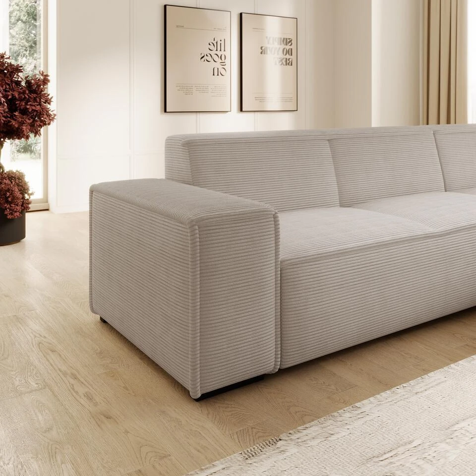 Hoekbank Cardiff is een moderne bank voor 3 personen in L-vorm. De bank is bekleed met een ribstof in de kleur beige. De stof voelt fijn aan en straalt warmte en comfort uit. Deze hoekbank beschikt over vaste zit- en rugkussens. Het meubel wordt ongemonteerd geleverd. Je dient het dus met behulp van de bijgeleverde handleiding zelf in elkaar te zetten.