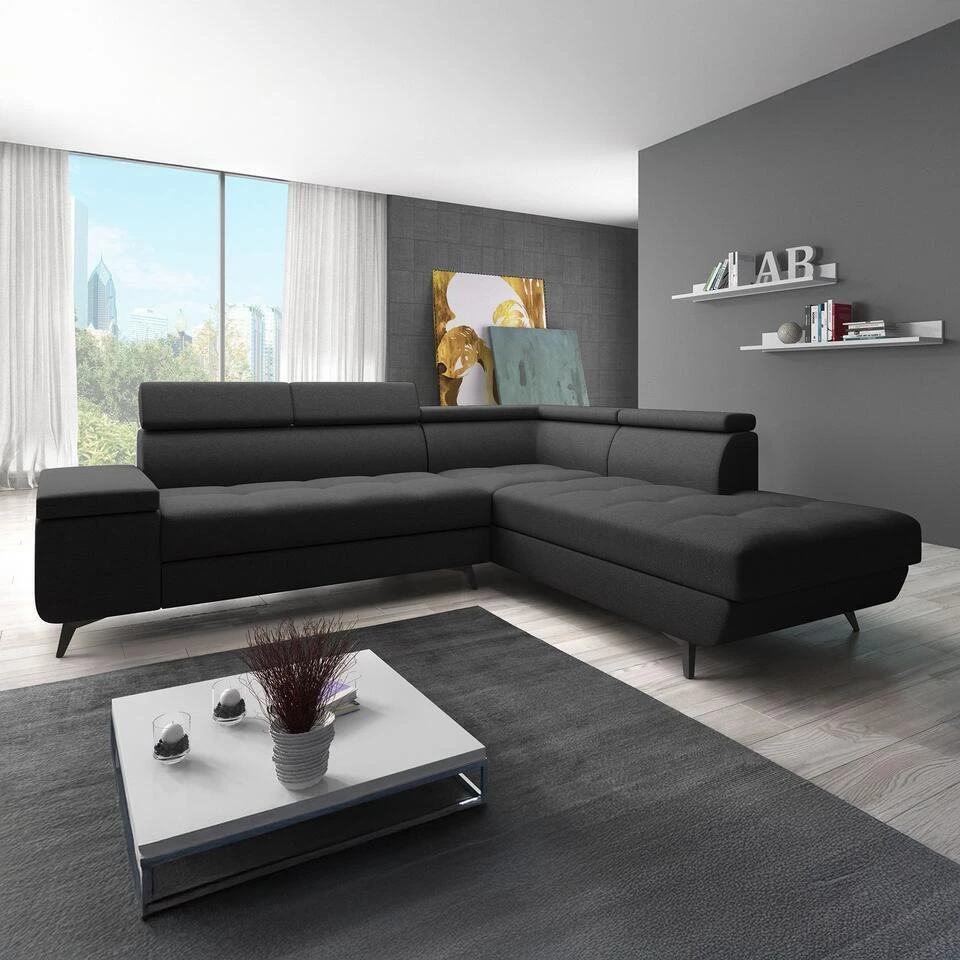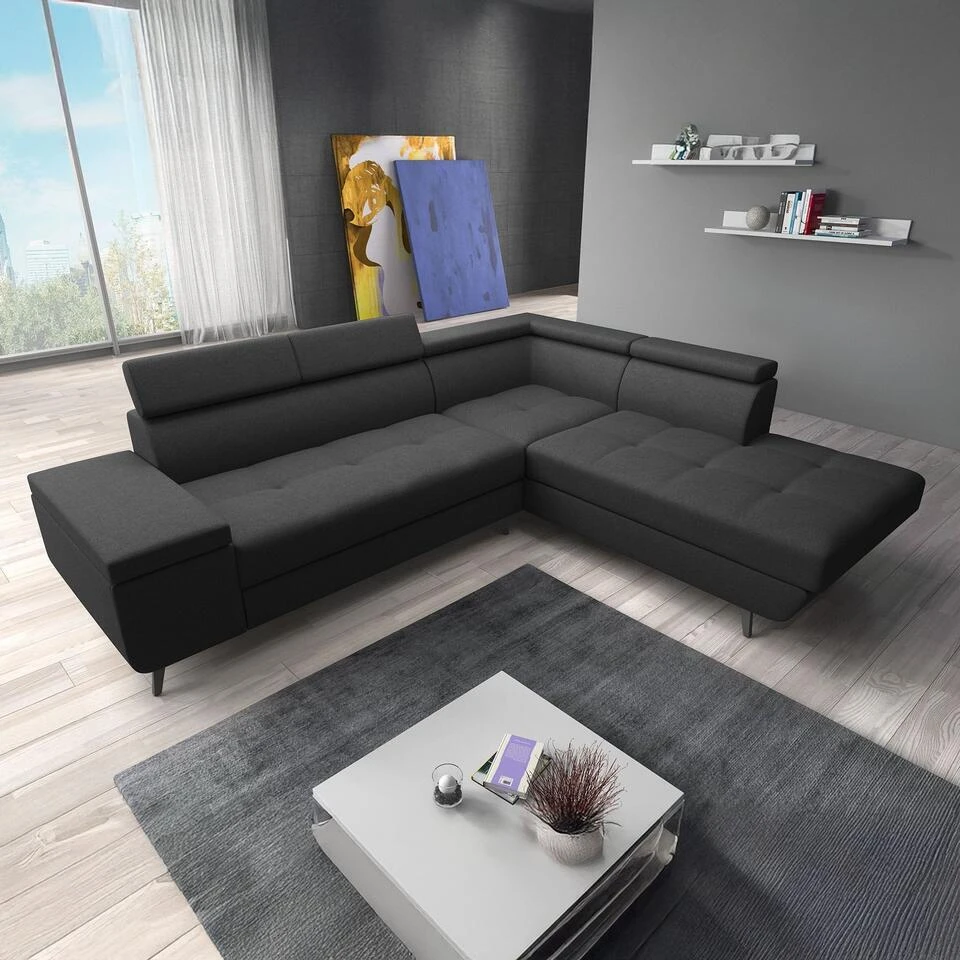 Hoekbank Destiny is gemaakt van stof in zwarte kleur. De Destiny is een L-vormige hoekbank. Staat op zwarte poten. De bank heeft vaste zit- en rugkussens. De hoofdsteunen zijn verstelbaar voor extra comfort. Het meubel wordt ongemonteerd geleverd. Je dient het dus met behulp van de bijgeleverde handleiding zelf in elkaar te zetten.