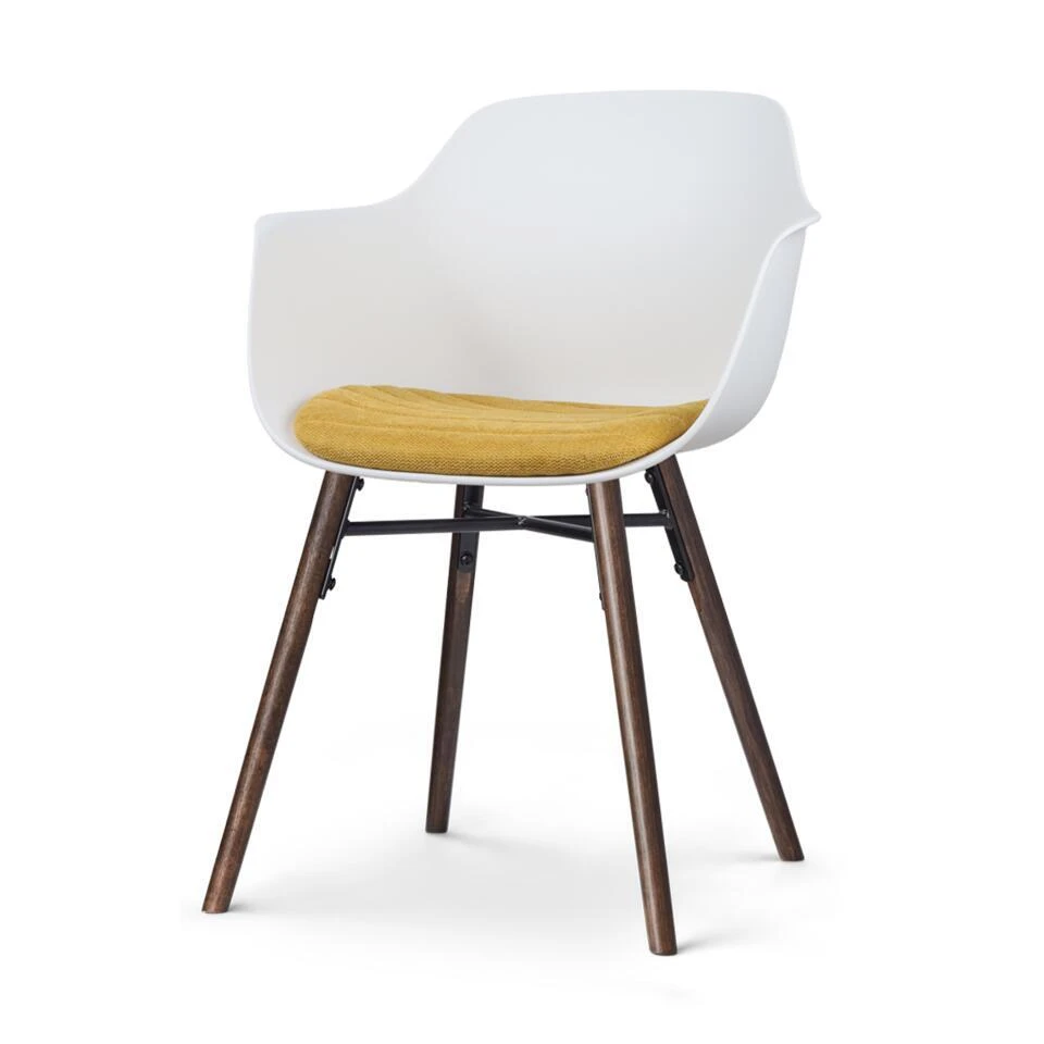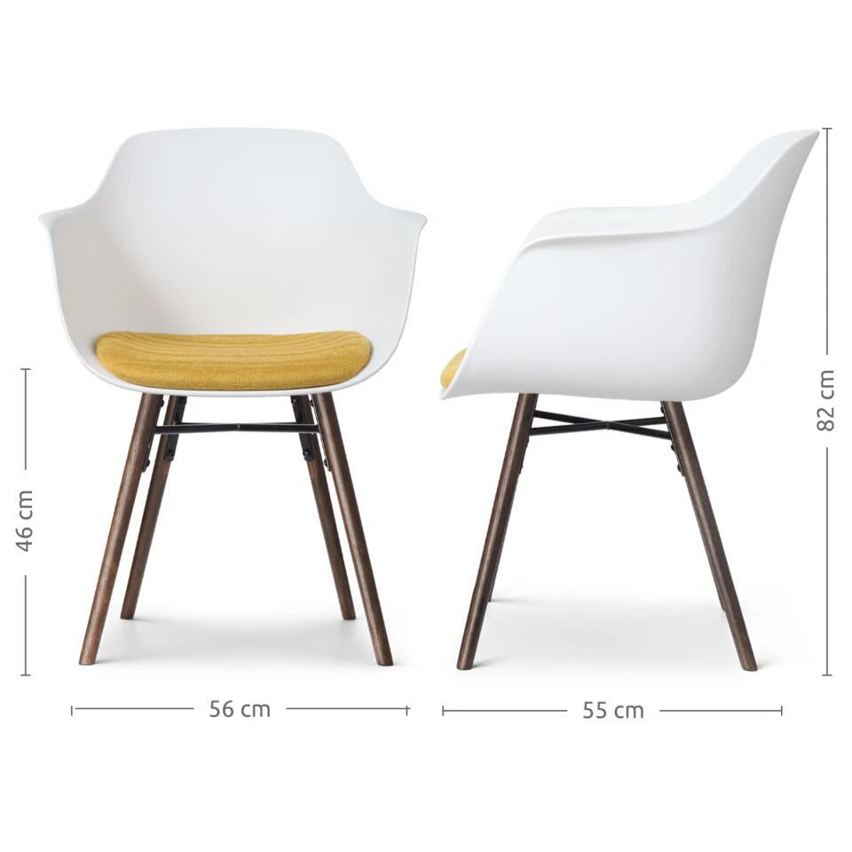 De combinatie van het strakke, eigentijdse ontwerp en de warme walnoot kleur van de houten poten voegt een vleugje elegantie toe aan elke eetkamer. De kunststof zitting van deze kuipstoel is niet alleen duurzaam, maar ook nog eens erg praktisch. Maak je geen zorgen over knoeien of morsen: het gladde oppervlak is gemakkelijk af te nemen met een vochtige doek. De houten poten zijn gemaakt van eikenhout, wat bijdraagt aan de duurzaamheid en stabiliteit van de stoel. Naast de ergonomische vorm van de kunststof zitting is de eetkamerstoel ook ontworpen met armleuningen, zodat je urenlang ontspannen aan tafel kan zitten. Het vaste zitkussen gemaakt van zachte stof tilt het comfort naar een nog hoger niveau en voegt wat zachtheid toe aan het ontwerp. Deze comfortabele kuipstoel is verkrijgbaar in twee verschillende kleuren en met vier kleuren stoelkussens, waardoor je eenvoudig de perfecte combinatie kunt vinden die past bij jouw persoonlijke stijl.