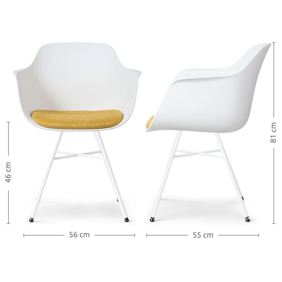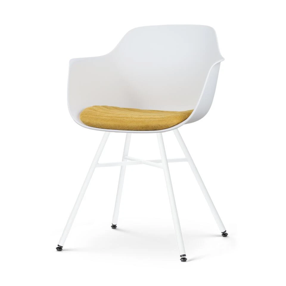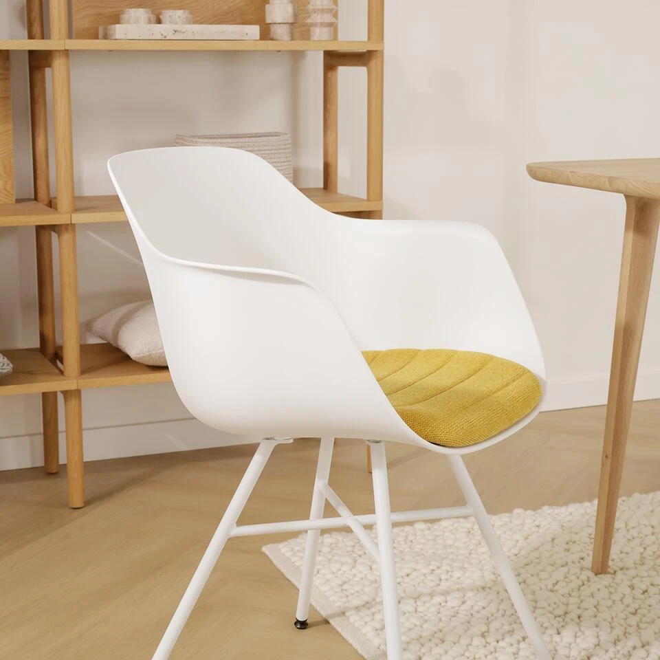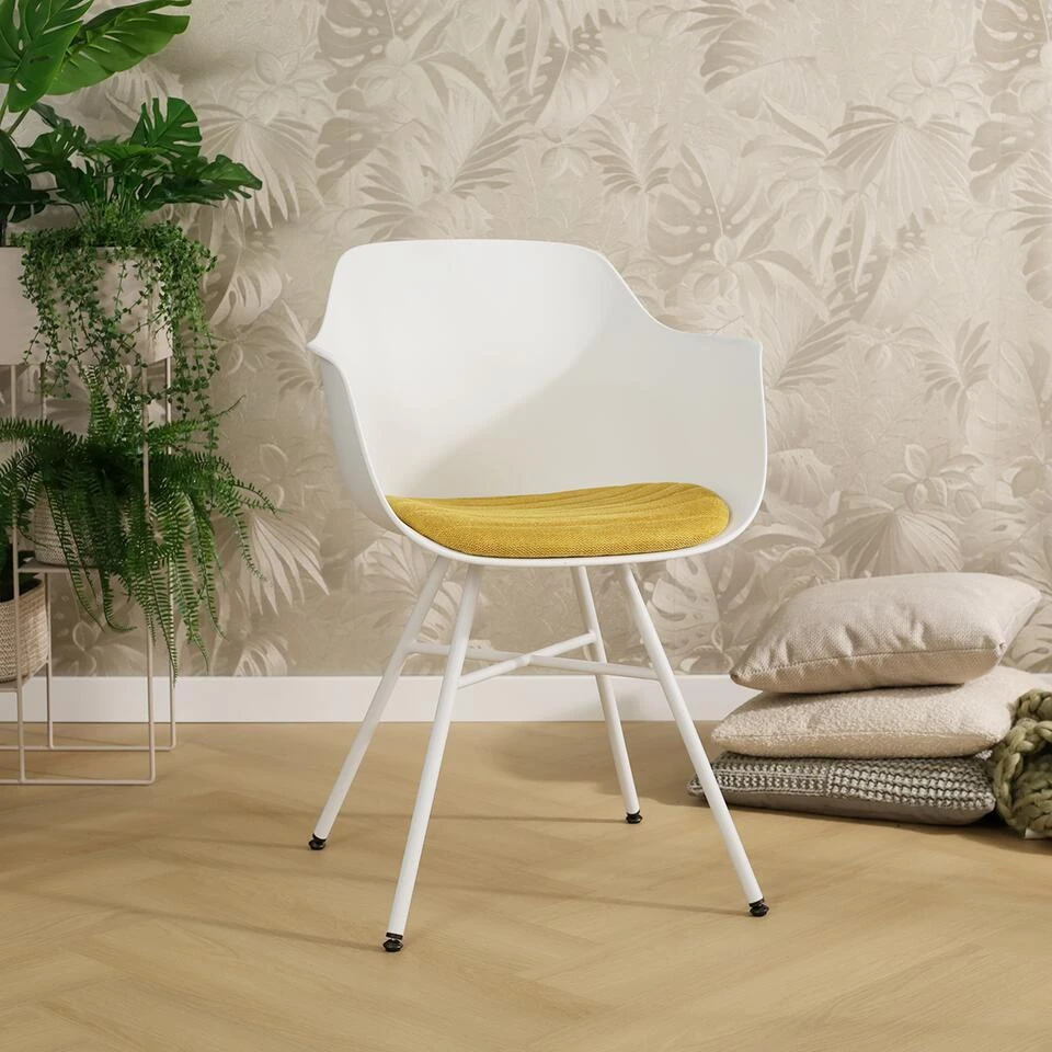Het leuke is dat je deze stoel zelf kunt samenstellen. Je kunt namelijk kiezen uit meerdere kleuren vaste zitkussens om jouw perfecte kuipstoel samen te stellen. Hierdoor creëer je een frisse uitstraling in je interieur. Bovendien heeft de zitting armleuningen die jouw extra comfort bieden. De eetkamerstoel is afgewerkt met een metalen onderstel met een kruis in het midden als leuk detail. Zie jij jezelf al genieten in deze comfortabele eetkamerstoel?