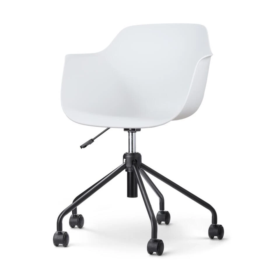 Deze moderne bureaustoel combineert een stoer en industrieel ontwerp met Scandinavische invloeden, waardoor hij naadloos in elk interieur past. De stoel is voorzien van een kunststof kuipzitting met armleuningen die optimale ondersteuning bieden tijdens lange werkdagen. Het metalen onderstel met zwarte poten is zowel stevig als functioneel, met een handige hoogteverstelling en een draaimechanisme dat 360 graden rotatie mogelijk maakt. Met een totale hoogte van 83 cm, een zithoogte van 46 cm en een zitdiepte van 46 cm, biedt de Nout-Puk voldoende ruimte voor comfortabel zitten. Verkrijgbaar in een mix van wit en zwart, deze bureaustoel is niet alleen praktisch maar ook een stijlvolle toevoeging aan je kantoorruimte.