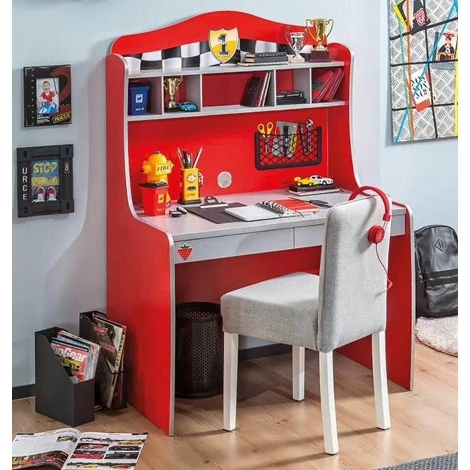 Het Race Cup autobureau is een prachtig exemplaar uit onze collectie van de Race Cup auto thema kamer. Dit stoere bureau is voorzien van twee handige lades en open schappen voor extra opbergruimte. Het ontwerp is volledig in stijl met het race thema en heeft opvallende raceprints. De afgeronde planken en het gladde werkoppervlak zorgen ervoor dat het bureau veilig is voor kinderen.