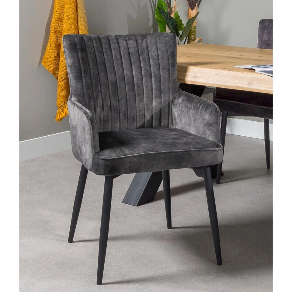 Robert eetkamerstoel is de perfecte combinatie van comfort en design. Deze comfortabele eetkamerstoel is afkomstig van het woonmerk Vurna. Hij is bekleed met een prettige velvet stof in het grijs of groen. Het onderstel is gemaakt van zwart staal. De armstoel heeft een comfortabele hoge rugleuning en armleuning. Daarnaast is deze eetkamerstoel voorzien van een handgreep in de achterzijde zodat de stoel niet vies wordt en nog langer mee gaat. De binnenkant heeft een verticale stiksel in de rugleuning voor een persoonlijke touch.