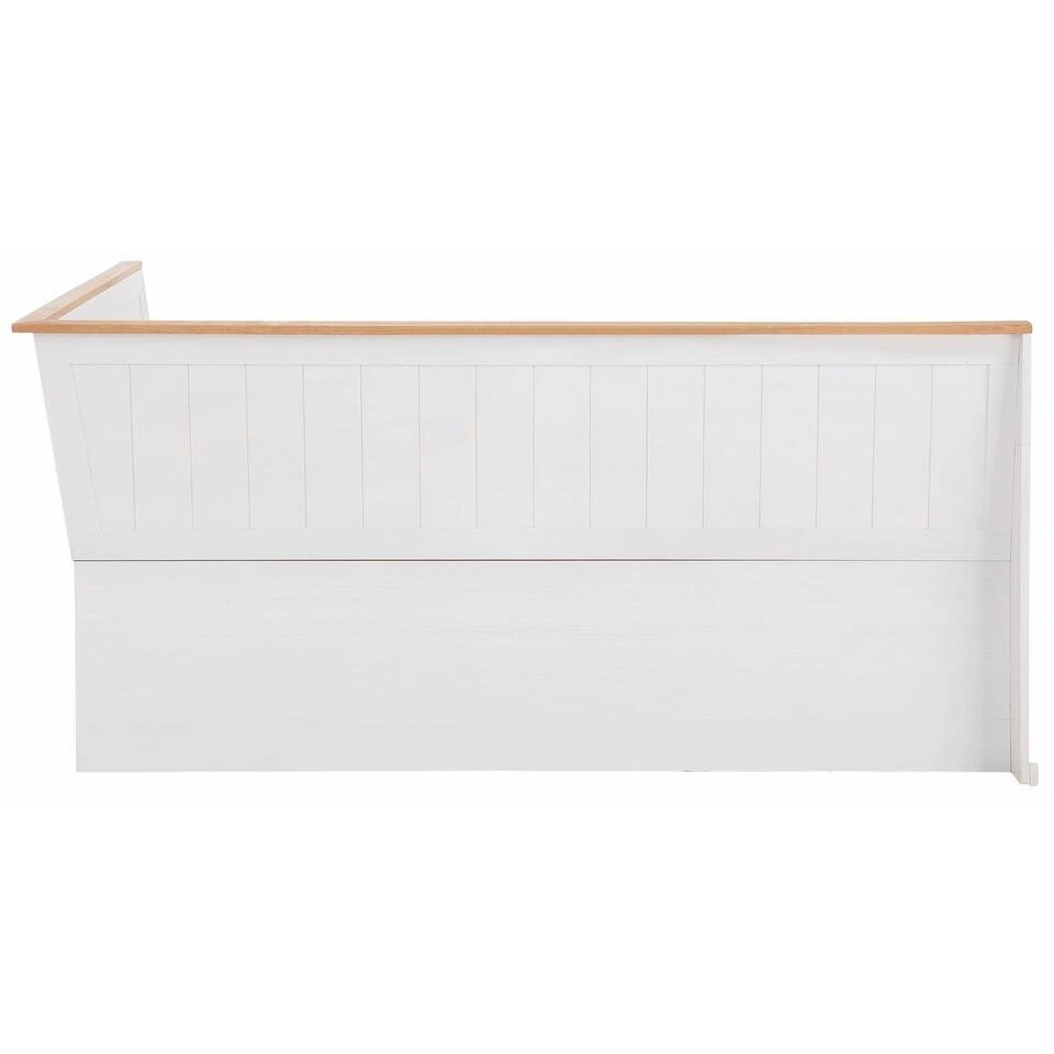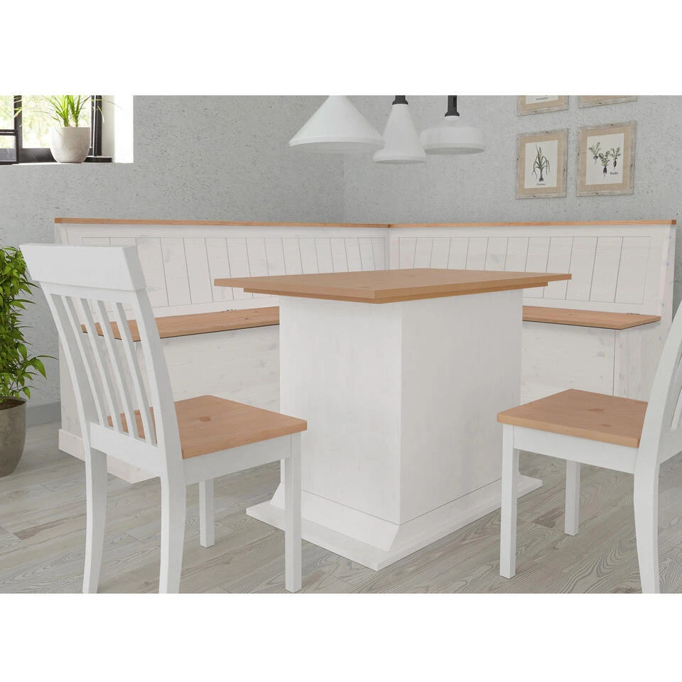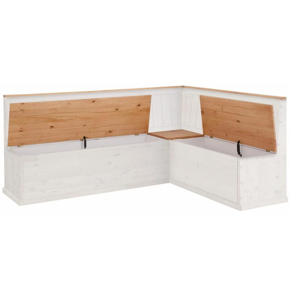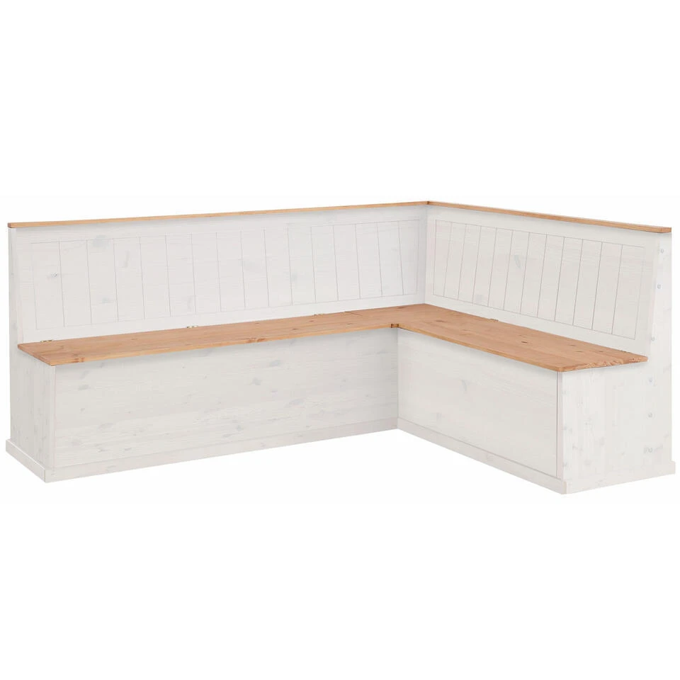 De hoekbank met praktische opbergruimte straalt een natuurlijke flair uit in de inrichting van je eetkamer. Hij vult je interieur aan in de trendy landelijke stijl en is ontworpen met mooie houtlook accenten. Met zijn ingetogen kleuren kan de bank gemakkelijk gecombineerd worden met je bestaande inrichting. Onder de zitting is handige opbergruimte voor bijvoorbeeld kussens textiel of woonaccessoires. De bank is gemaakt van hoogwaardig massief grenen. De hoekbank met praktische opbergruimte past in elke woonstijl.