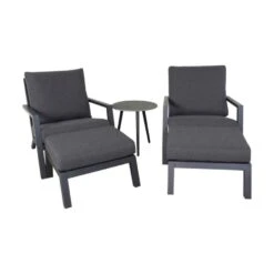Het frame van de Atlanta loungeset is gemaakt van aluminium en voorzien van een coating in de kleur antraciet. Het voordeel van aluminium is dat dit materiaal niet kan gaan roesten, licht van gewicht is en weinig onderhoud nodig heeft. De comfortabele kussens zijn voorzien van afritsbare hoezen zodat deze uitgewassen kunnen worden. Mocht je de loungestoelen niet in gebruik hebben dan adviseren wij om de kussens op een droge en geventileerde plek op te bergen. Het handige bijzettafeltje heeft een onderstel van aluminium en een tafelblad van keramiek.