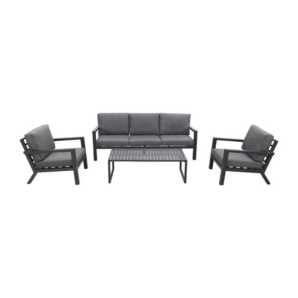 De Hugo loungeset heeft een frame van aluminium. Dit materiaal is gekozen doordat het bestand is tegen verschillende weersinvloeden en niet kan gaan roesten. Hierdoor kan jij lang genieten van je loungeset zonder al te veel onderhoud! Voor extra bescherming tegen krassen en stoten is er een antracietkleurige coating aangebracht op het aluminium. De kussens worden standaard meegeleverd bij deze set. Houdt er rekening mee dat de kussens niet waterbestendig zijn. Wij raden ook aan om de kussens droog en geventileerd op te bergen wanneer ze niet worden gebruikt. Dit kan bijvoorbeeld in de schuur, garage of opbergbox.