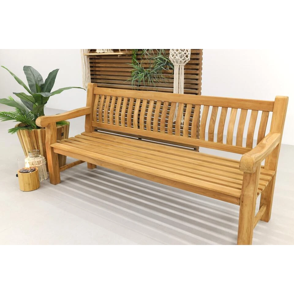 Gemaakt van robuust teakhout, is deze bank uitstekend bestand tegen de wisselende weersomstandigheden in Nederland. Teakhout is een hardhoutsoort met een hoge dichtheid en natuurlijke oliën, waardoor het duurzaam is en weinig onderhoud nodig heeft. Een regelmatige schoonmaakbeurt met een zachte borstel en water houdt het hout in topconditie. Om de warme kleur van het hout te behouden en vergrijzing te voorkomen, kun je de bank behandelen met Teak Protector.