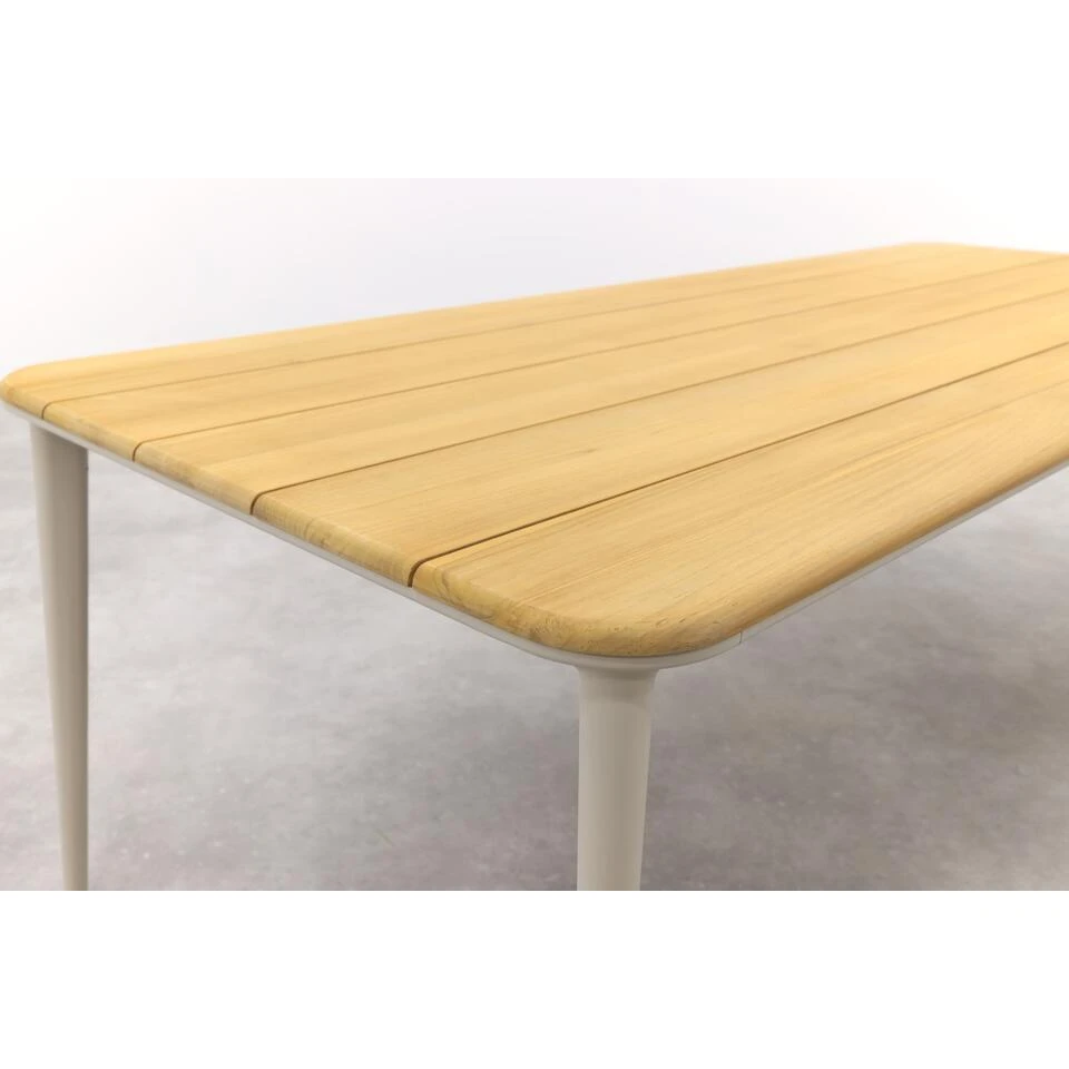 De Alaska tuintafel is een elegante combinatie van een teakhouten tafelblad en een mokka-kleurig aluminium frame. Het teakhouten blad heeft een warme, bruine tint die een gezellige sfeer uitstraalt. Teakhout is een duurzaam hardhout dat na verloop van tijd een natuurlijke vergrijzing ondergaat, wat bijdraagt aan de karakteristieke charme van de tafel. Wil je de oorspronkelijke bruine kleur behouden? Met het juiste onderhoud kun je de warme tinten gemakkelijk herstellen. Het tafelblad rust op een lichtgewicht, onderhoudsvriendelijk en stevige aluminium frame, waardoor je jarenlang plezier hebt van deze prachtige tuintafel.