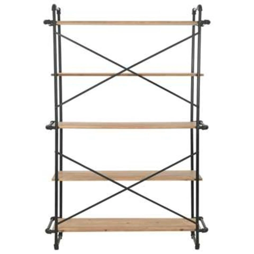 Het staande schap is gemaakt van een stevig stalen frame en massief vurenhouten planken en is zeer robuust en duurzaam. De boekenkast heeft 5 schappen die voldoende ruimte bieden voor het opbergen en weergeven van je boekencollectie, dvd’s, mappen en andere, decoratieve spullen. De gekruiste stalen achterstructuren dragen bij aan de industriële stijl van de boekenplank.