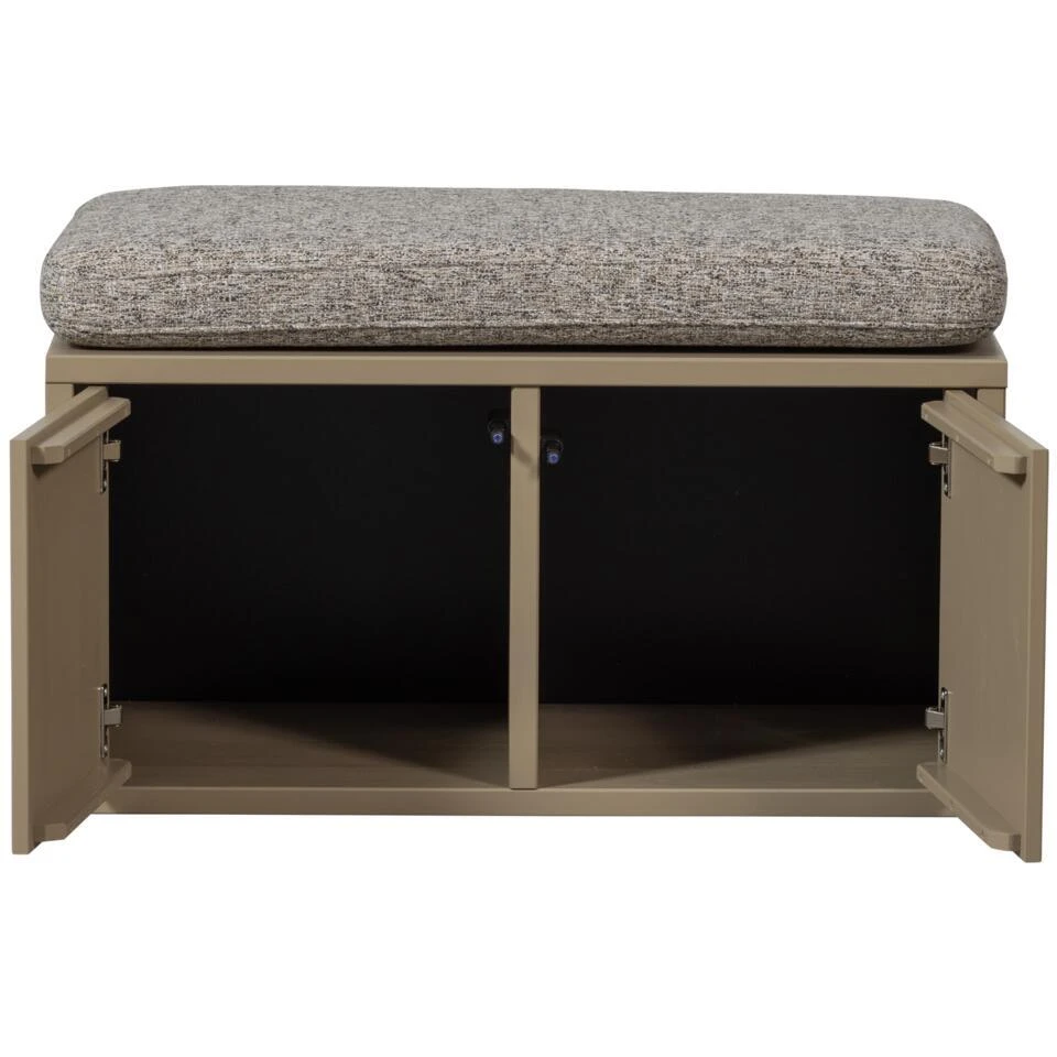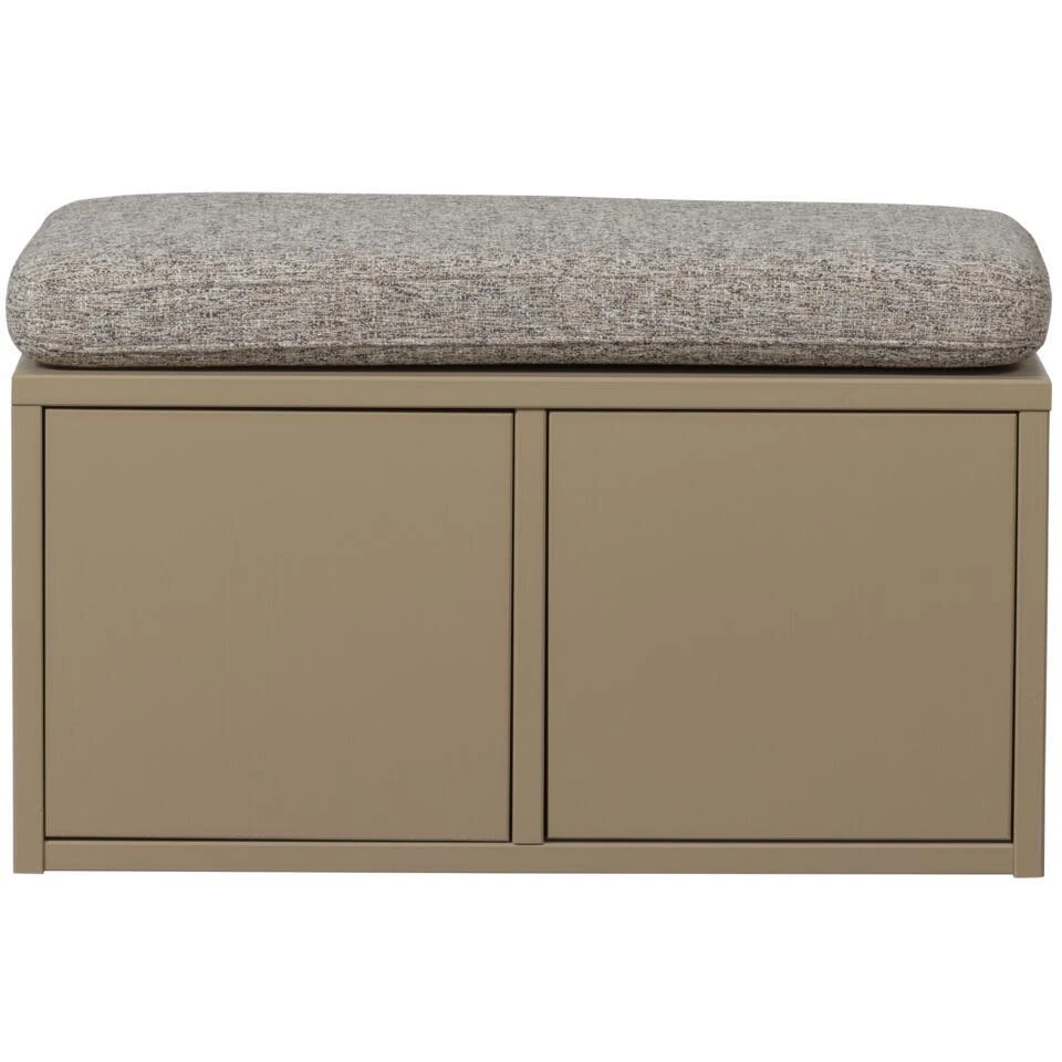 De Turner opbergserie komt uit de collectie van het Nederlandse interieurmerk WOOOD en wordt gekenmerkt door het strakke, minimalistische design. De grenenhouten uitvoering zorgt voor een mooie blend in jouw interieurstijl. Het zitkussen is bekleed met een grof geweven stof in de kleur khaki.